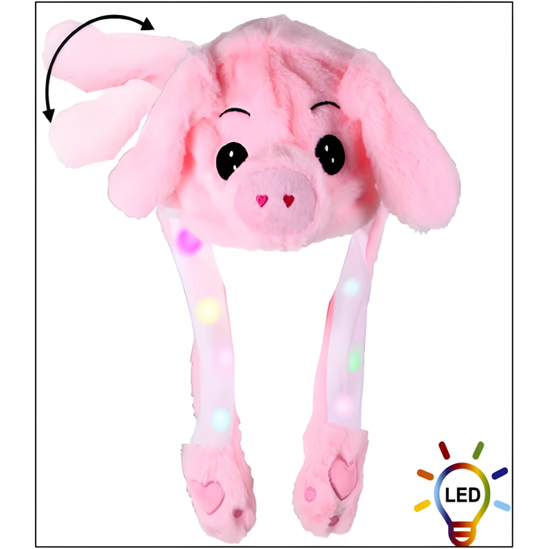 BONNET COCHON ROSE AVEC LES OREILLES QUI BOUGENT + LEDS À 3 FONCTIONS.