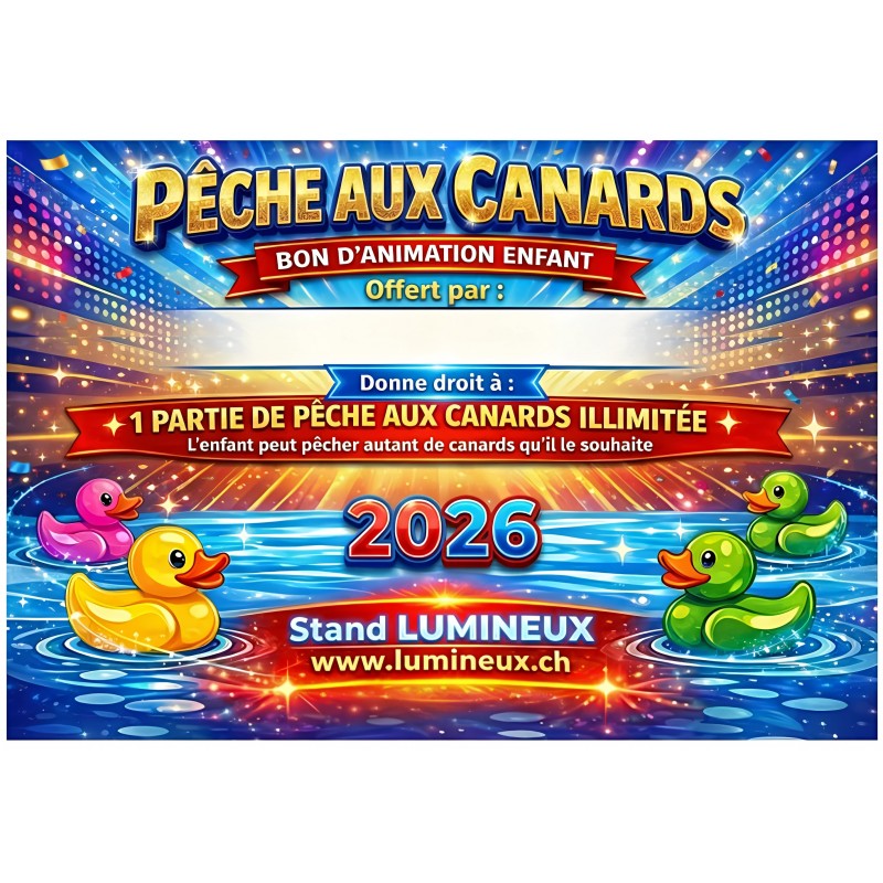 Je vous propose d’acheter des bons d’animation “Pêche aux canards” à tarif préférentiel, que vous pourrez offrir à vos clients, familles ou partenaires.