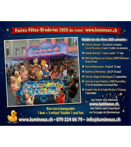 - Validité : foires 2026 ( liste indiquée sur le bon et sur mon site internet lumineux.ch sur la page de bienvenue )