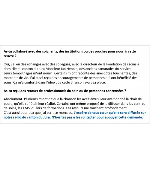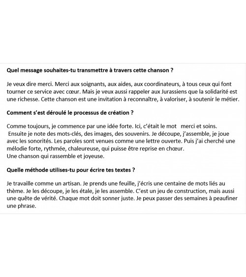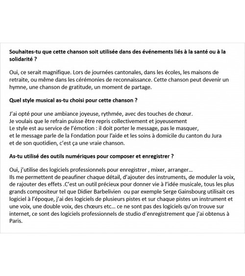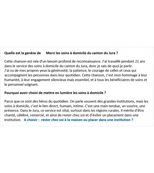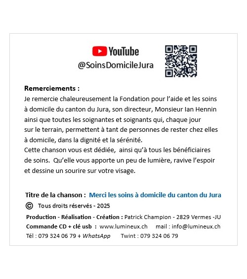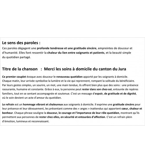 Découvrez la chanson « Merci les soins à domicile du canton du Jura », une œuvre originale composée spécialement pour rendre hommage aux équipes de soins à domicile.